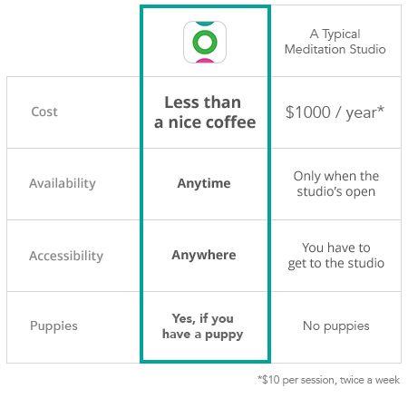 Strokovnjaki nas vodijo po posameznih meditacijah, s katerimi lahko osvajamo osnove meditiranja, odkrivamo srečo in celo spreminjamo svoje navade. Za kar najboljšo izkušnjo si lahko ustvarimo svoj studio, izberemo glasbo za ozadje, posamezne seanse pa si lahko kar prenesemo na svoj telefon, da jih lahko poslušamo kjerkoli, tudi brez povezave do interneta.