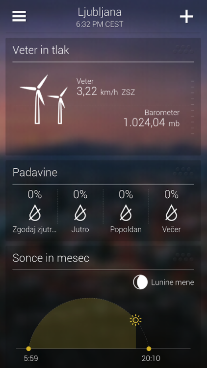 Temu sledi zemljevid, ki prikazuje trenutno stanje našega ozračja (oblaki). Če nanj kliknemo, lahko pregledamo še vročinski zemljevid in zemljevid hitrosti vetra. Temu sledijo še informacije o vetru in pritisku z zanimivo animacijo vrtečih se vetrnih turbin ter napoved za verjetnost padavin v naslednjih delih dneva. Na koncu lahko vidimo še animacijo Sonca, kje se trenutno nahaja, kdaj je vstalo in kdaj bo zašlo. Prav tako lahko vidimo tudi trenutno stanje lunine mene. Dodajanje mest je enostavno: kliknemo na plus simbol zgoraj desno in vpišemo mesto. Razpored mest lahko spreminjamo po želji, med njimi pa se pomikamo z drsanjem levo in desno.