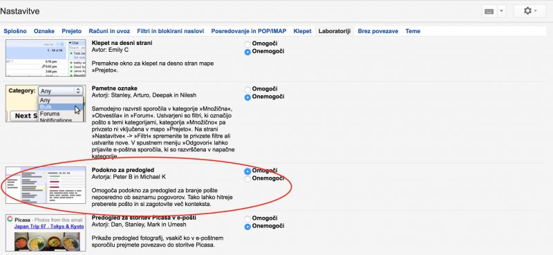 Tako kot v Outlooku lahko tudi v Gmailu nastavite možnost, da se vam sporočila na desni strani odpirajo v predogledu, tako da vam ni treba odpirati vsake sporočila posebej. Če želite dodati to funkcijo, se odpravite v nastavitve in nato poiščite zavihek “Laboratoriji”. V laboratoriju najdete dodatke, ki so jih razvili tretji razvijalci in niso uradno podprti s strani Googla, vendar lahko vseeno olajšajo in pohitrijo delo. Na seznamu dodatkov poiščite tistega z imenom “Podokno za predogled” in ob njem stisnite na “Omogoči”. Na koncu ne pozabite shraniti sprememb na dnu. Ko se vrnete na mapo Prejeto, boste ob gumbu za nastavitve videli nov gumb, ki odpre okno s predogledom. Kliknite nanj in videli boste predoglede vaših sporočil v stolpu na desni strani. Z gumbom lahko nastavite le seznam sporočil, predogled sporočil v vertikalni obliki ali v horizontalni obliki pod seznamom sporočil.